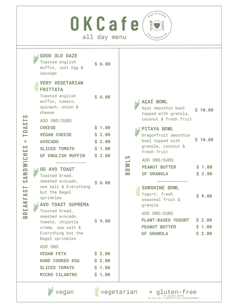 Just Egg, potatoes, plant-based sausage, OKC house pico de gallo, chipotle crema & cheeze wrapped in a grilled tortilla Side of roasted salsa